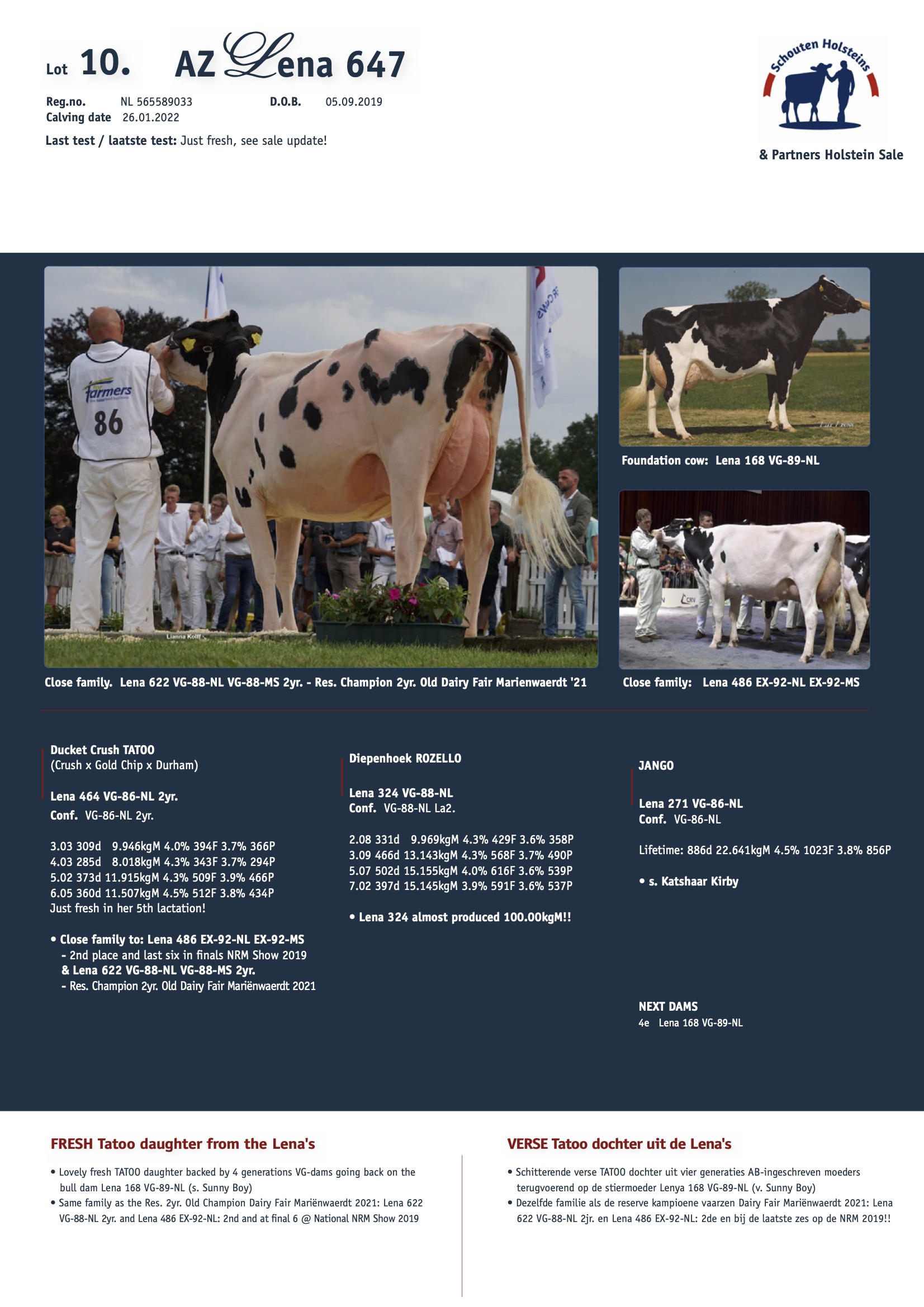 • Same family as the Res. 2yr. Old Champion Dairy Fair Mariënwaerdt 2021: Lena 622 VG-88-NL 2yr. and Lena 486 EX-92-NL: 2nd and at final 6 @ National NRM Show 2019